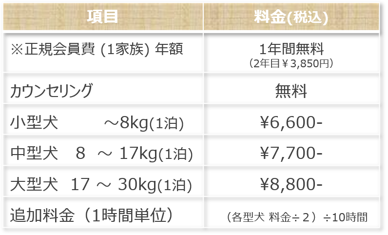 ※ドッグラン以外、初めてサービスご利用時は、正規会員費と初回カウンセリングが必要となります。